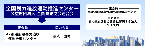 「暴力団員による不当な行為の防止等に関する法律」(暴力団対策法)では、暴力団員による不当な行為の防止と被害の救済を図ることを目的として設立された公益法人を、各都道府県公安委員会が「都道府県暴力追放運動推進センター」として指定することができ、また、国家公安委員会が「全国暴力追放運動推進センター」として指定することができることとされています。