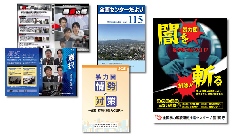 機関誌「全国センターだより」、パンフレット、ポスター、リーフレット等の制作・発行を行なうとともに、暴力追放啓発用DVDを作成し、暴排知識の普及に努めています。