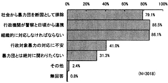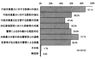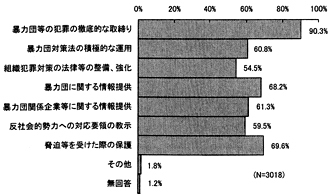 不当要求等対策を推進するに当たり、警察に対して望むこととしては、「暴力団等反社会的勢力による犯罪の徹底的な取締り」(90.3%)をあげたものが9割と圧倒的に多く、「脅迫を受けた際の保護」(69.6%)がこれに続くなど警察の執行力に対する要望が強いことがうかがわれる。以下、「暴力団等反社会的勢力に関する情報」の提供(68.2%)、「暴力団関係企業に関する情報の提供」(61.3%)などの情報提供を求めるものが続く。