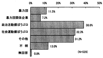 最近1年間に不当要求等があったとする529件について、不当要求等を行ってきた者をみると、「政治活動標ぼうゴロ」(38.6%)をあげたものが最も多く、「社会運動標ぼうゴロ」(32.3%)、「その他」(31.2%)と続き、「暴力団」(11.5%)や「暴力団関係企業」(7.2%)を大きく上回っている。