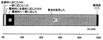 最近1年間に不当要求等があったとする529件について、不当要求等に対する対処の仕方をみると、「全ての不当要求を拒否した」(87.1%)とするものが大部分で9割近くにのぼった。しかし、一方で「全ての不当要求等に応じた」とするものが5件(0.9%)あり、これに「不当要求等の一部に応じた」(10件・1.9%)、「当初拒否したが最終的には不当要求等に全面的に応じた」(3件・0.6%)及び「当初拒否したが最終的に不当要求等の一部に応じた」(41件・7.8%)を合わせると、一部でも要求に応じたものは59件(11.2%)になる。