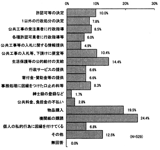 最近1年間に不当要求等があったとする529件について不当要求等の内容をみると、「機関紙(誌)の購読」(24.4%)をあげたものが最も多く、「物品購入」(19.5%)とともに比較的多かった。次いで、行政特有のものとしての「生活保護等の公的給付の支給」(14.4%)、「公共工事の入札、指名、受注、下請に関する便宜等」(10.4%)、「許認可等の決定」(10.0%)、「公共工事の受注業者に対する行政指導等」(8.5%)と続いている。