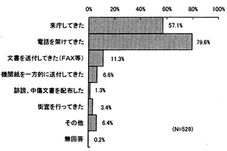 最近1年間に不当要求等があったとする529件について、不当要求等の態様をみると「電話を架けてきた」(79.6%)をあげたものが最も多く、次いで「来庁してきた」(57.1%)も6割近くがあげており、「文書を送付してきた」(11.3%)、「機関紙(誌)を一方的に送付してきた」(6.6%)などを大きく上回っており、大部分が来庁したり電話をかけてくるなど、直接働きかけてきていることがうかがわれる。