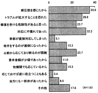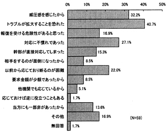 少なくとも一部でも不当要求等に応じたとする59件について、不当要求等に応じた理由をみると「トラブルが拡大することを恐れた」(40.7%)をあげたものが最も多く、要求に応じたとする59件のうち4割を超えた。次いで、「威圧感を感じたから」(32.2%)、「対応に不慣れであったから」(27.1%)、「以前から応じており、断るのが困難だから」(22.0%)が続く。「平成14年度行政対象暴力に関するアンケート」における同様の質問に対する回答結果と比較すると、「トラブルが拡大することを恐れた」、「幹部が直接対応してしまった」、「当方にも一部非があった」をあげたものの割合が多くなっている。