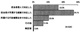 最近1年間に不当要求等があったとする529件について、不当要求等に対する対応の仕方をみると「担当者が所属する組織で対応した」(54.1%)をあげたものが最も多く、「所属する行政機関全体で対応した」をあげたものも20.8%あったが、「担当者個人で対応した」をあげたものも33.5%あった。