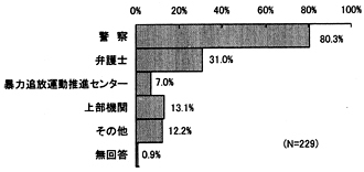 前記11で部外者に相談したとする229件について、その相談先をみると、「警察」(80.3%)をあげたものが最も多く8割を超えた。次いで「弁護士」(31.0%)、「上部機関」(13.1%)となっている。「暴力追放運動推進センター」をあげたのは7.0%であったが、「平成14年度行政対象暴力に関するアンケート」における同様の質問では「暴力追放運動推進センター」をあげたものは3.2%であり、今回はその割合が倍増している。