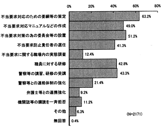 前記13で、不当要求等対策の取組みを行っているとする2,171件についてその取組み内容をみると、「不当要求対応のための要綱等の策定」(63.2%)をあげたものが最も多く、次いで「不当要求対策のための委員会等の設置」(51.2%)、「不当要求対応マニュアル等の対応要領の作成」(49.0%)、「警察・暴力追放運動推進センターの講習・研修の受講」(43.3%)、「職員に対する研修」(42.8%)、「不当要求防止責任者の選任」(41.3%)などとなっており、組織内の方針や体制の整備、職員の対応能力の向上に向けた取組みが行われていることがうかがわれる。