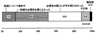 前記13で、不当要求等対策の取組みを行っていないとする818件についてその理由を見ると、「必要性は感じたが、手が回らなかった」(36.9%)とするものが最も多かった。一方で、「取組みの必要性を感じなかった」(36.6%)とするものがほぼ同数あった。「現在、取組みについて検討中である」とするものは14.5%であった。