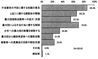 暴力追放運動推進センターの活動で力を入れて欲しいものとしては、「反社会的勢力の実態や不当要求等の予防に関する知識の普及」(86.4%)をあげたものが8割を超えて最も多く、「暴力団等反社会的勢力による不当な行為に関する相談」(70.0%)、「反社会的勢力の実態や不当要求等の予防に関する知識の普及に関する講習会の開催」(66.3%)が続き、反社会的勢力対策に関する知識の普及活動に対する要望が強いことがうかがわれる。次いで、「市町村や業界等で行う暴力団排除活動や事務所撤去活動への協力・支援活動」(55.3%)となっている。