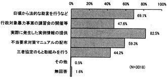 不当要求対策を推進するに当たり、弁護士、弁護士会に対して望むこととしては、「実際に発生した不当要求の事例やそれに自治体や警察等の関係機関がどのように対処して解決したかといった実例情報の提供」(82.5)をあげたものが8割を超えて最も多かった。次いで「職員に対し、日頃から法的な助言を行う、若しくは相談を受理する体制を整えること」(69.1%)、「行政機関を対象とした不当要求対策マニュアルの配布」(59.3)などが続く。