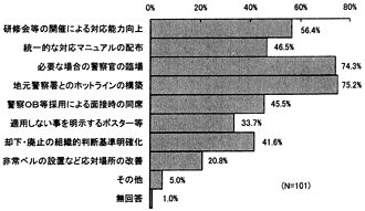 今後、生活保護から暴力団員を確実に排除していくために必要なものとしては、「地元警察署とのホットラインの構築」(75.2%)をあげたものが最も多く、「必要な場合の警察官の臨場(立ち会い)」(74.3%)がほぼ同じ割合で続き、警察との連携を求めるものが高い割合を占めた。以下、「生活保護担当職員に対する定期的な研修会等の開催による対応能力の向上」(56.4%)、「統一的な対応マニュアルの配布」(46.5%)、「警察OB等の採用による面接時の同席」(45.5%)など対応能力の向上を求めるものが続く。