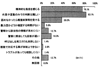 上記21で、問題点があるとした71件につき問題点の内容をみると、「暴力団員との申し出がない限り、外見や言動のみでは判断することは難しい」(83.1)が圧倒的に多く8割を超え、「精神的な負担を感じる」(76.1%)、「認めなかったら報復、糾弾等を受ける危険性がある」(38.0%)が続き、担当職員の多くがこの事務を難しいと感じていることがうかがわれる。