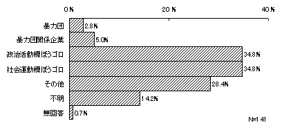 最近1年間に不当要求等があったとする141件について、不当要求等を行ってきた者をみると、えせ右翼等の「政治活動標ぼうゴロ」と、えせ同和行為者等の「社会運動標ぼうゴロ」をあげたものが共に49件(34.8%)と多く、「暴力団関係企業」(7件・5.0%)及び「暴力団」(4件・2.8%)を大きく上回っている。他、「その他」とした回答では、「悪質クレーマー」や「会社・新聞ゴロ」などをあげている。