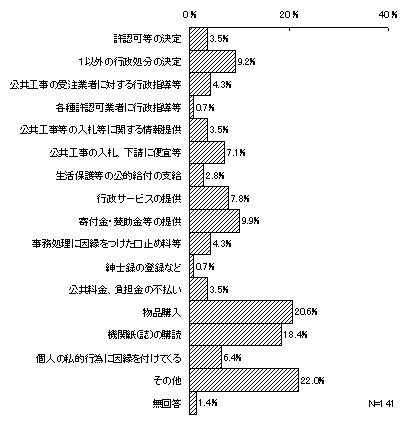 最近1年間に不当要求等があったとする141件について不当要求等の内容をみると、「その他」を除くと「物品購入」をあげたものが最も多く29件(20.6%)となっている。次いで、「機関紙(誌)の購読」26件(18.4%)、「寄付金・賛助金等の提供」(14件・9.9%)、「1以外の行政処分の決定(許認可等の決定以外)」(13件・9.2%)などとなっている。行政事務に関するものとしては、「行政サービスの提供」11件(7.8%)、「公共工事等の入札、指名、受注、下請に関する便宜等」10件(7.1%)などとなっている。他、「その他」とした回答では、「時間外対応の強要」や「各種検査の合格強要」などをあげている。