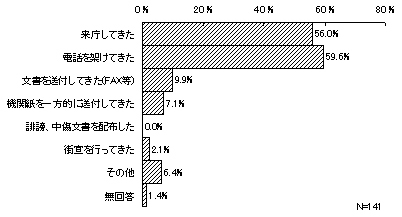 最近1年間に不当要求等があったとする141件について、不当要求等の態様をみると、「電話を架けてきた」をあげたものが84件(59.6%)と最も多く、次いで、「来庁してきた」が79件(56.0%)となっており、直接的に要求を行う態様が占める割合が高く、「文書を送付してきた」(14件・9.9%)や「機関紙を一方的に送付してきた」(10件・7.1%)などを大きく上回っている。
