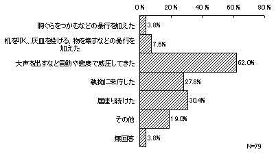 前記5「不当要求等の態様」で相手方が来庁してきたとする79件について、来庁時の相手方の態様をみると、「大声を出すなど言動や態度で威圧してきた」が49件(62.0%)と最も多く、次いで、「居座り続けた」24件(30.4%)、「執拗に来庁した」22件(27.8%)となっている。その他、「机を叩く、灰皿を投げる、物を壊すなどの暴行を加えた」(6件・7.6%)や「胸ぐらをつかむなどの暴行を加えた」(3件・3.8%)など、具体的な暴行を行ったとするものもあった。他、「その他」とした回答では、「口調は穏やかだが繰り返し不当要求」や「社会運動であることを強調して不当要求」などをあげている。