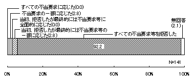 最近1年間に不当要求等があったとする141件について、不当要求等に対する対処の仕方をみると、ほとんどが「全ての不当要求等を拒否した」としており9割を超えている(130件・92.2%)。一方、「不当要求の一部に応じた」と「当初、拒否したが最終的には不当要求等の一部に応じた」が共に4件(2.8%)となっており、合わせて8件(5.6%)が不当要求に応じたとしている。