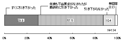 前記7「対処の仕方」において、当初、不当要求等を拒否した134件(「当初、拒否したが最終的には不当要求等の一部に応じた」、「すべての不当要求等を拒否した」を合わせたもの)について、不当要求等を拒否した時の相手方の行動をみると、「何度も不当要求がなされたが最終的に引き下がった」77件(57.5%)、「すぐに引き下がった」40件(29.9%)となっており、両者を合わせると9割近く(117件・87.4%)が引き下がったとしている。一方、「引き下がらなかった」とするものも1割を超えている(14件・10.4%)。