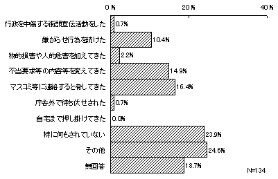 過去に暴力団、暴力団関係企業、総会屋、政治活動標ぼうゴロ、社会運動標ぼうゴロ、特殊知能暴力集団等の反社会的勢力から許認可、工事等の契約、指導監督、公金支給等の権限行使や機関紙(誌)の購読、物品の購入等に関して違法な行為や不当な要求(以下「不当要求等」という)を受けた経験の有無については、「ある」とするものが1割を超えている(341件・11.5%)。