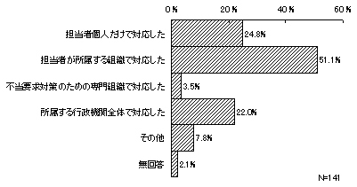 最近1年間に不当要求等があったとする141件について、不当要求等に対する対応の仕方をみると、「担当者が所属する組織(部署)で対応した」72件(51.1%)、「所属する行政機関全体で対応した」31件(22.0%)となっており、組織的に対応したとする割合が高くなっているが、「担当者個人で対応した」とするものも35件(24.8%)あった。「不当要求対策のための専門組織で対応した」をあげたのは5件(3.5%)であった。