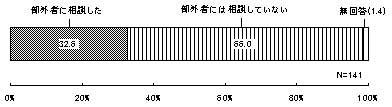最近1年間に不当要求等があったとする141件について、対処に際して部外者への相談の有無についてみると、「部外者には相談していない」とする割合が高く93件(66.0%)となっており、「部外者に相談した」は46件(32.6%)となっている。