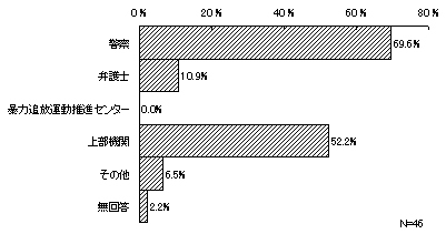 前記12「対処に際して部外者への相談の有無」で、部外者に相談したとする46件について、その相談先をみると、「警察」をあげたものが最も多く7割近く(32件・69.6%)となっており、次いで、「上部機関」(24件・52.2%)、「弁護士」(5件・10.9%)となっている。