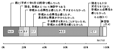 前記14で過去4年間における不当要求等対策への取組みについて「取り組まなかった」とするもの710件について、その理由をみると、「不当要求を受けたことがないため、取組みの必要性を感じなかった」が最も多く過半数近く(343件・48.3%)を占めた。一方で、「既に(平成17年8月以前)取り組んでいた」(106件・14.9%)、「現在でも十分対応できており、取組みの必要性を感じなかった」(86件・12.1%)となっており、取り組んでいるまたは対応ができているとするものは、両者を合わせると192件(27.0%)あった。