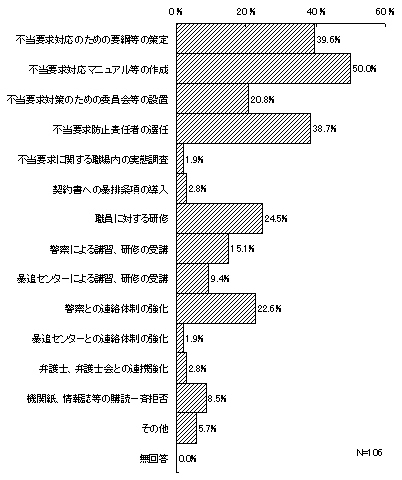 また、既に(平成17年8月以前)取り組んでいたとする106件について、取組の内容をみると、「不当要求対応マニュアル等の作成」が最も多く過半数(53件・50.0%)を占める。次いで、「不当要求対応のための要綱等の策定」(42件・39.6%)、「不当要求防止責任者の選任」(41件・38.7%)、「職員に対する研修」(26件・24.5%)などとなっている。また、「機関紙(誌)、情報誌等の一斉拒否」(9件・8.5%)や「公共工事や委託業務、リース等の契約書への暴排条項の導入」(3件・2.8%)など、直接的な対策への取組みとするものもあった。(複数回答)