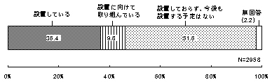 専門組織の設置については、全回答のうち「設置しておらず、今後も設置する予定はない」とするものが過半数を超えており(1,526件・51.6%)、次いで、「設置している」1,078件(36.4%)、「設置に向けて取り組んでいる」289件(9.8%)となっている。