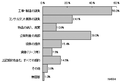 前記18「契約書・契約規定等への暴力団排除条項の有無」において、暴力団排除条項を盛り込んでいるとする684件について、暴力団排除条項の導入状況をみると、「工事・製造の請負」への導入が最も多く半数以上(383件・56.0%)となっている。次いで、「公有財産の売却」267件(39.0%)、「コンサルタント業務の請負」165件(24.1%)、「役務の提供」105件(15.4%)などとなっている。また、「上記契約を含む、すべての契約」とするものが99件(14.5%)あった。