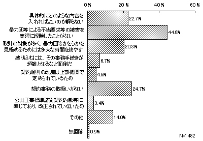 前記18「契約書・契約規定等への暴力団排除条項の有無」において、暴力団排除条項を盛り込んでおらず、今後も盛り込む予定はないとする1,482件について、その理由をみると、「暴力団等による不当要求等の被害を実際に経験したことがない」が661件(44.6%)で最も多い。次いで、「契約事務の取扱いがない」366件(24.7%)、「具体的にどのような内容を入れればよいのか解らない」336件(22.7%)、「取引の対象が多く、暴力団等かどうかを見極めるためには多大な時間を費やす」301件(20.3%)などとなっている。他、「その他」とした回答では、「入札条件に盛り込まれている」や「必要性を感じない」などをあげている。
