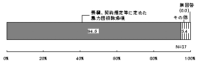 前記22で最近1年間に暴力団等の排除措置をとったことがあるとする37件について、暴力団関係企業の排除の根拠をみると、「要綱、契約規定等に定めた暴力団排除条項」が大多数(35件・94.6%)を占めている。