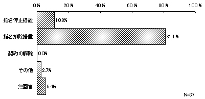 前記22で最近1年間に暴力団等の排除措置をとったことが「ある」とする37件について、排除の具体的措置をみると、「指名排除措置」が8割以上(30件・81.1%)を占めており、次いで、「指名停止措置」4件(10.8%)となっている。