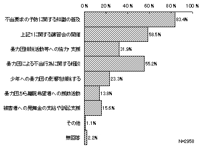 暴力追放運動推進センターの活動で力を入れて欲しいものとしては、「暴力団等反社会的勢力の実態や不当要求等の予防に関する知識の普及」が最も多く全回答の8割を超え(2,467件・83.4%)、次いで、「上記1(知識の普及)に関する講習会の開催」が1,731件(58.5%)となっている。反社会的勢力対策に関する知識の普及活動に対する要望が強いことがうかがわれる。以下、「暴力団員による不当な行為に関する相談」1,634件(55.2%)、「市町村や業界等で行う暴力団排除活動や事務所撤去活動への協力・支援活動」944件(31.9%)などとなっている。