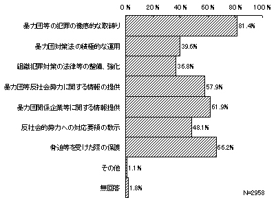 警察に対して望むこととしては、全回答のうち、「暴力団等反社会的勢力による犯罪の徹底的な取締り」が最も多く8割を超え(2,407件・81.4%)、次いで、「脅迫等を受けた際の保護」1,958件(66.2%)となっており、警察の執行力に対する要望が強いことがうかがわれる。以下、「暴力団関係企業等に関する情報提供」1,830件(61.9%)、「暴力団等反社会勢力に関する情報の提供」1,714件(57.9%)、「暴力団等反社会的勢力への対応要領の教示」1,424件(48.1%)などとなっている。