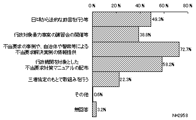 弁護士、弁護士会に対して望むこととしては、「不当要求の事例や、自治体や警察等による不当要求解決実例の情報提供」が最も多く7割を超えている(2,150件・72.7%)。次いで、「行政機関を対象とした不当要求対策マニュアルの配布」1,721件(58.2%)、「職員に対し、日頃から法的な助言を行う、若しくは相談を受理する体制を整えること」1,457件(49.3%)、「行政対象暴力事案に関する講演会の開催や研修会への講師の派遣」1,148件(38.8%)、「三者協定(注)のもとで、具体的な行政対象暴力事案について、救済に向けた取組みを行う」661件(22.3%)となっている。