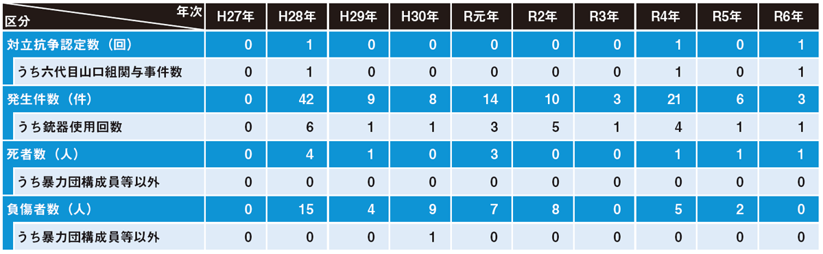 今後も、市民生活の安全確保に向け、必要な警戒や取締りの徹底に加え、暴力団対策法の効果的な運用等により事件の続発防止を図るとともに、各団体の弱体化及び壊滅に向けた取組を推進していくこととしています。