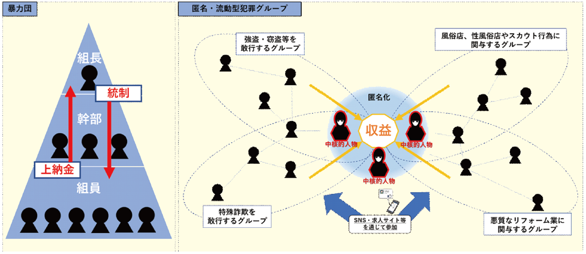 近年、暴力団の勢力が減衰していく中、暴走族の元構成員や暴力団の元構成員等を中心として、繁華街・歓楽街等で活動している準暴力団に加えて、新たな特徴を有する「匿名・流動型犯罪グループ」が台頭し、治安対策上の脅威となっています。暴力団は、構成員同士が擬制的な血縁関係によって結び付き、多くの場合、「組長」の統制の下に、地位の上下によって階層的に構成されており、組織の威力を背景に又は威力を利用して資金獲得活動を行っていました。これに対し、匿名・流動型犯罪グループは、各種資金獲得活動により得た収益を吸い上げている中核部分は匿名化されており、また、SNSや求人サイトを通じるなどして緩やかに結び付いたメンバー同士が役割を細分化させ、その都度、犯罪実行者募集情報への応募者を末端の実行犯として、言わば「使い捨て」にするなど、メンバーを入れ替えながら多様な資金獲得活動を行うため、組織の把握やメンバーの特定が容易ではないという特徴を有しています。