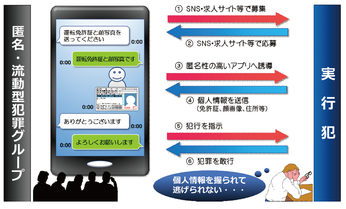 具体的には、犯罪を敢行するに当たって、SNS等において、「高額バイト」等の表現を用いたり、仕事の内容を明らかにせずに著しく高額な報酬の支払を示唆したりするなどして、犯罪の実行犯を募集している実態が認められます。匿名・流動型犯罪グループは、このような犯罪実行者募集情報への応募者に対して、あらかじめ運転免許証や顔写真等の個人の特定に資する情報を匿名性の高い通信手段を使用して送信させることで、応募者が犯行をちゅうちょしたり、グループからの離脱意思を示したりした場合には、個人情報を把握しているという優位性を利用して脅迫するなどして服従させ、実行犯として繰り返し犯罪に加担させるなどの状況がみられます。また、応募者が犯罪を敢行したとしても約束した報酬が支払われない場合もあります。