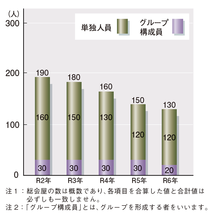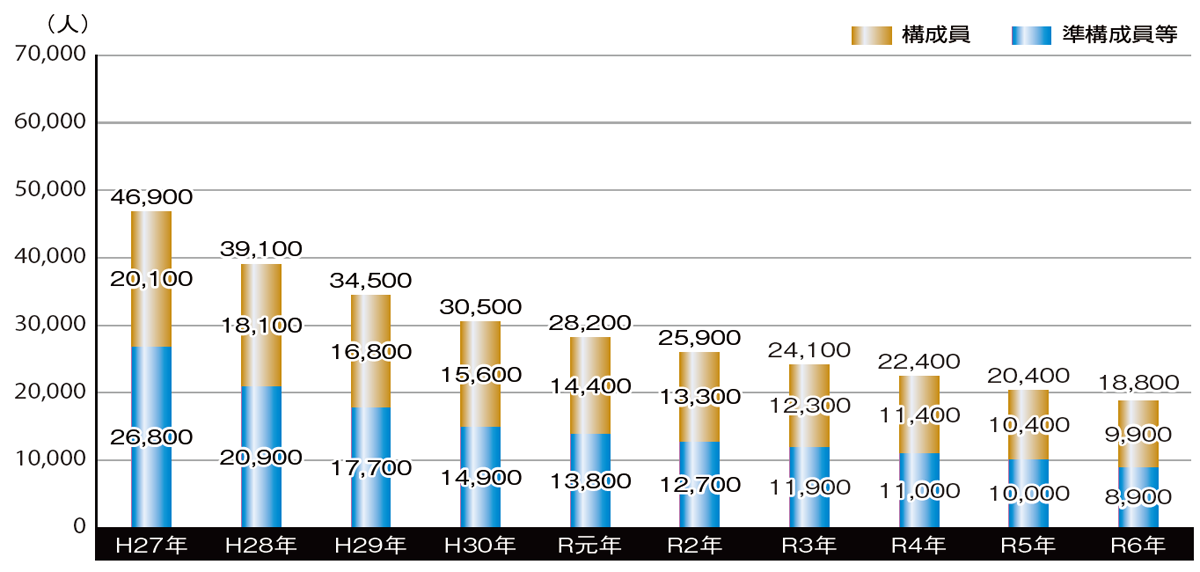暴力団とは、「その団体の構成員が集団的に又は常習的に暴力的不法行為等を行うことを助長するおそれがある団体」(「暴力団対策法」第2条第2号)のことをいい、その構成員及び準構成員等注1(以下、この項において「暴力団構成員等」といいます。)の数は、令和6年末現在18,800人注2で、前年と比べ、1,600人減少しました。このうち、暴力団構成員の数は9,900人で、前年に比べ500人減少し、準構成員等の数は8,900人で、前年に比べ1,100人減少しました。
