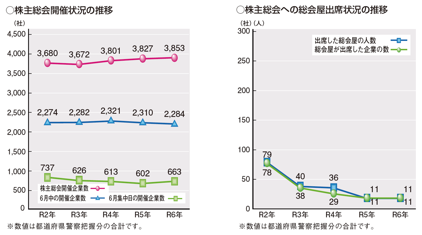 令和6年においては、11 企業の株主総会に延べ11 人の総会屋が出席しています。
