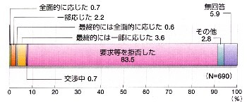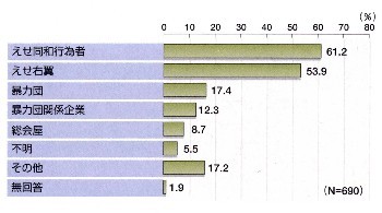 最近1年間にえせ右翼からの糾弾活動を受けたことが「ある」とする企業が全回答企業のうち64社(3.7%)あった。この64社のうち、29社は上場企業であった。