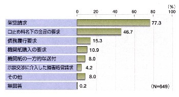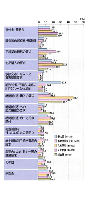 えせ右翼から要求を受けた372社についてみると、「機関紙(誌)購入の要求」(144社・38.7%)に次いで多いのは「寄付金・賛助金名下の金品の要求」(98社・26.3%)で、以下、「物品購入の要求」(84社・22.6%)、「機関紙(誌)の一方的な送付」(51社・13.7%)と続く。
