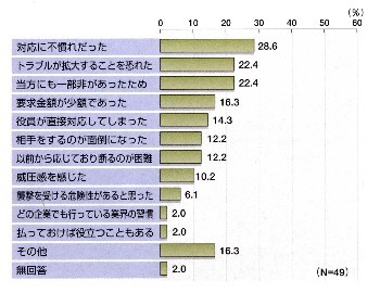 総会屋から要求を受けた60社についてみると、「機関紙(誌)購入の要求」(19社・31.7%)に次ぐのは「寄付金・賛助金名下での金品の要求」(15社・25.0%)で、以下「株主総会の運営を紛糾させない見返りとしての金品の要求」(13社・21.7%)、「機関紙(誌)への広告掲載の要求」(9社・15.0.%)、「機関紙(誌)の一方的な送付」(8社・13.3%)となっている。