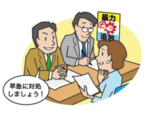 暴力団員の不当な要求は、犯罪として刑事事件になったり、暴力団対策法の規定に基づく都道府県公安委員会の行政処分(中止命令、再発防止命令)の対象となったりすることが多いので、暴力団員から不当な要求を受けた場合は、直ちに警察に被害を届け出ることが早期解決の道でもあります。